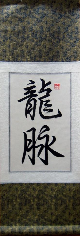 Dragon veins are where life energies flow, and this Feng Shui art work will add these symbolic characters to your home or office encouraging the flow of Chi in your life.The Chinese characters for dragon veins were painted on this scroll by Beijing, China artist Xie Tian Hai. In Feng Shui dragon veins are the locations where Chi or "life energies" flow, both in the human body and in the earth. Our dragon veins Chinese characters calligraphy painting is mounted on a beautiful silver/gray wall scroll ready to be displayed without the need for framing.